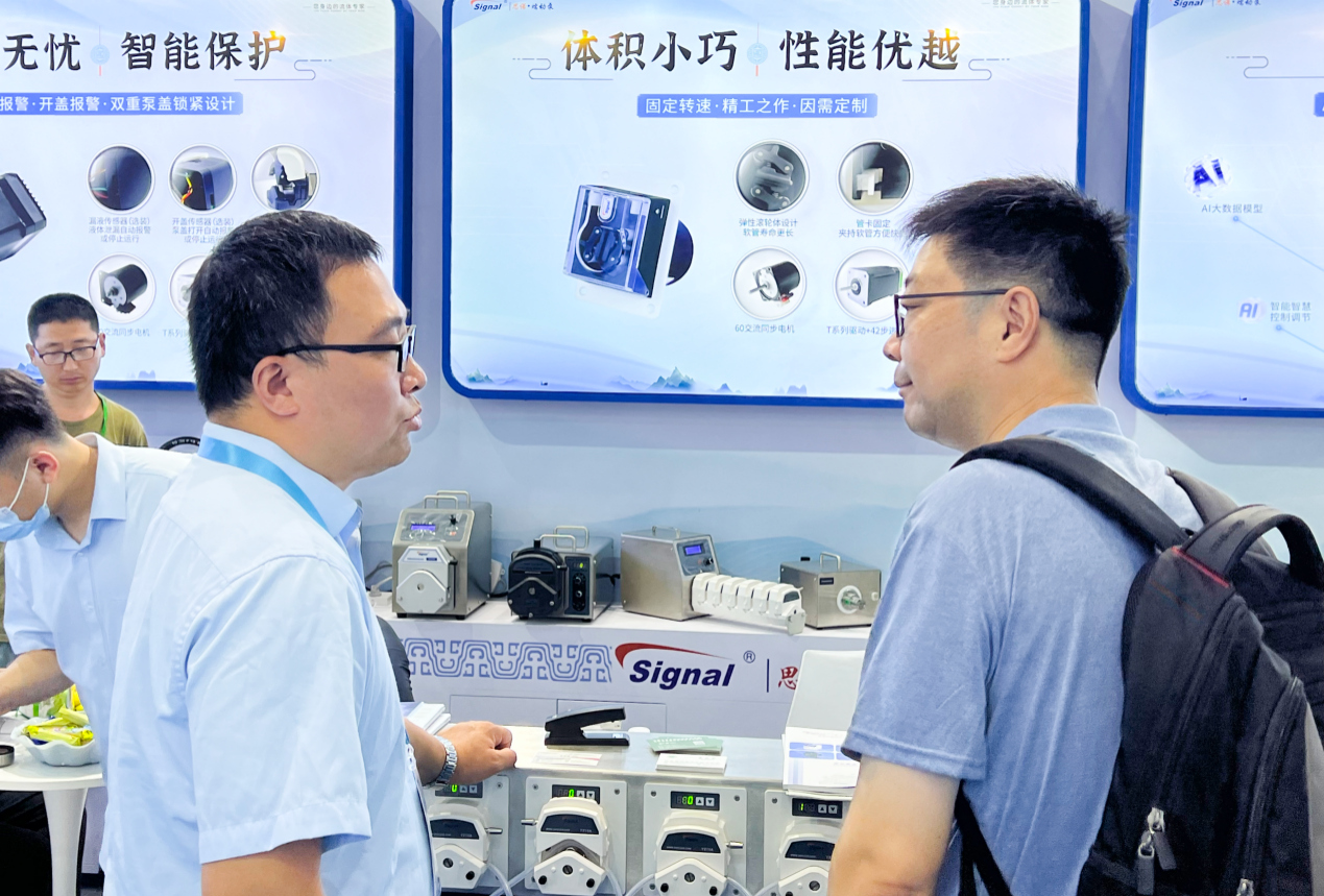 在展會現場,思諾流體展示了眾多蠕動泵產品,包括AI智能型蠕動泵、蠕動泵灌裝系統,新研發的蠕動泵泵頭和OEM等,吸引了眾多參觀者駐足咨詢,展臺人氣旺盛。